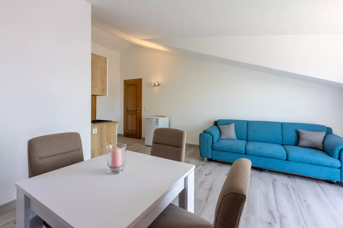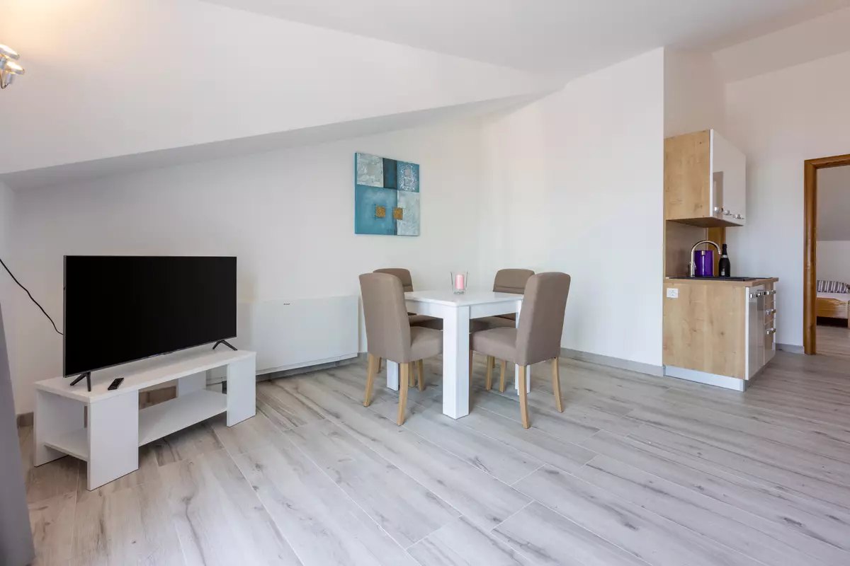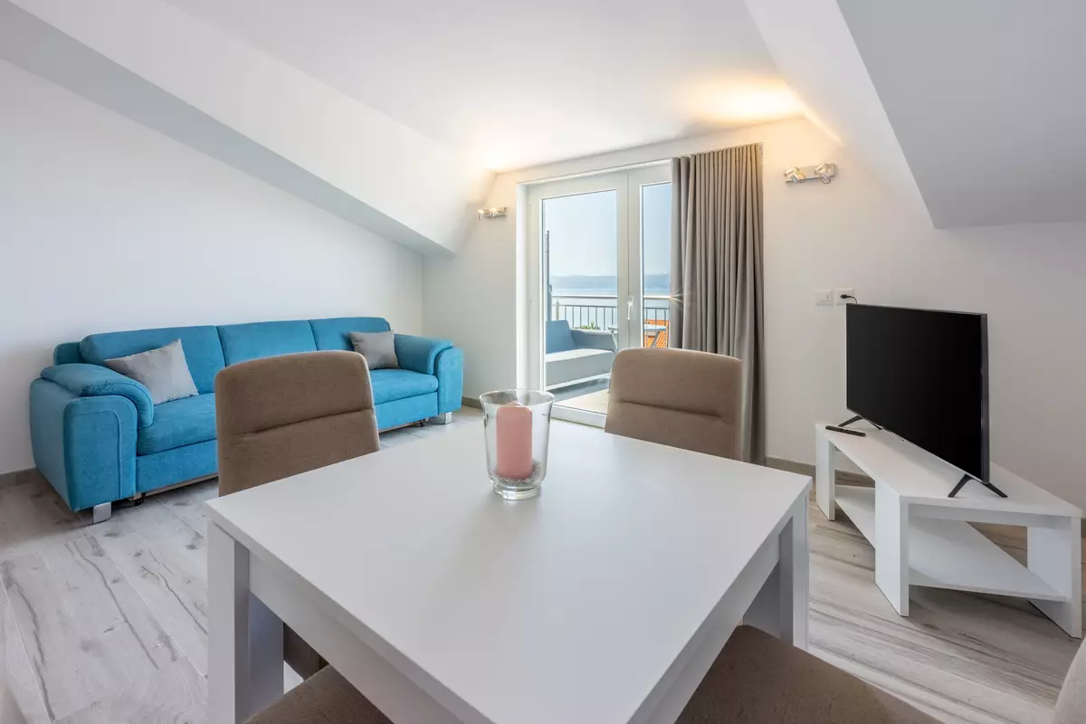 Wohn/Esszimmer und Küche sind ein Raum, Schlafcouch für zwei Personen, Balkon, Meerblick, Fliesen, Sat-TV