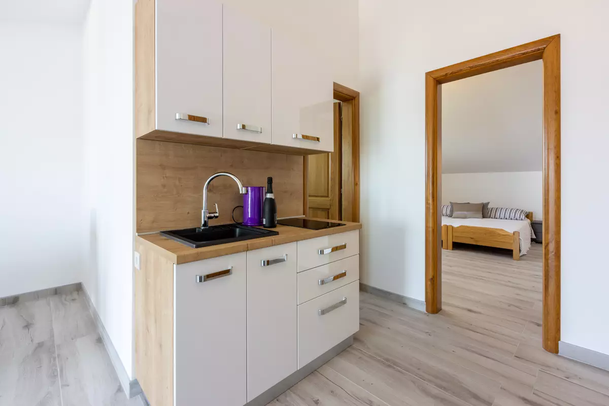 Die Wohnung liegt im 3. Obergeschoß, und besteht aus einem geräumigen Wohn-/Esszimmer mit Küche im selben Raum, einem Schlafzimmer und einem Badezimmer.